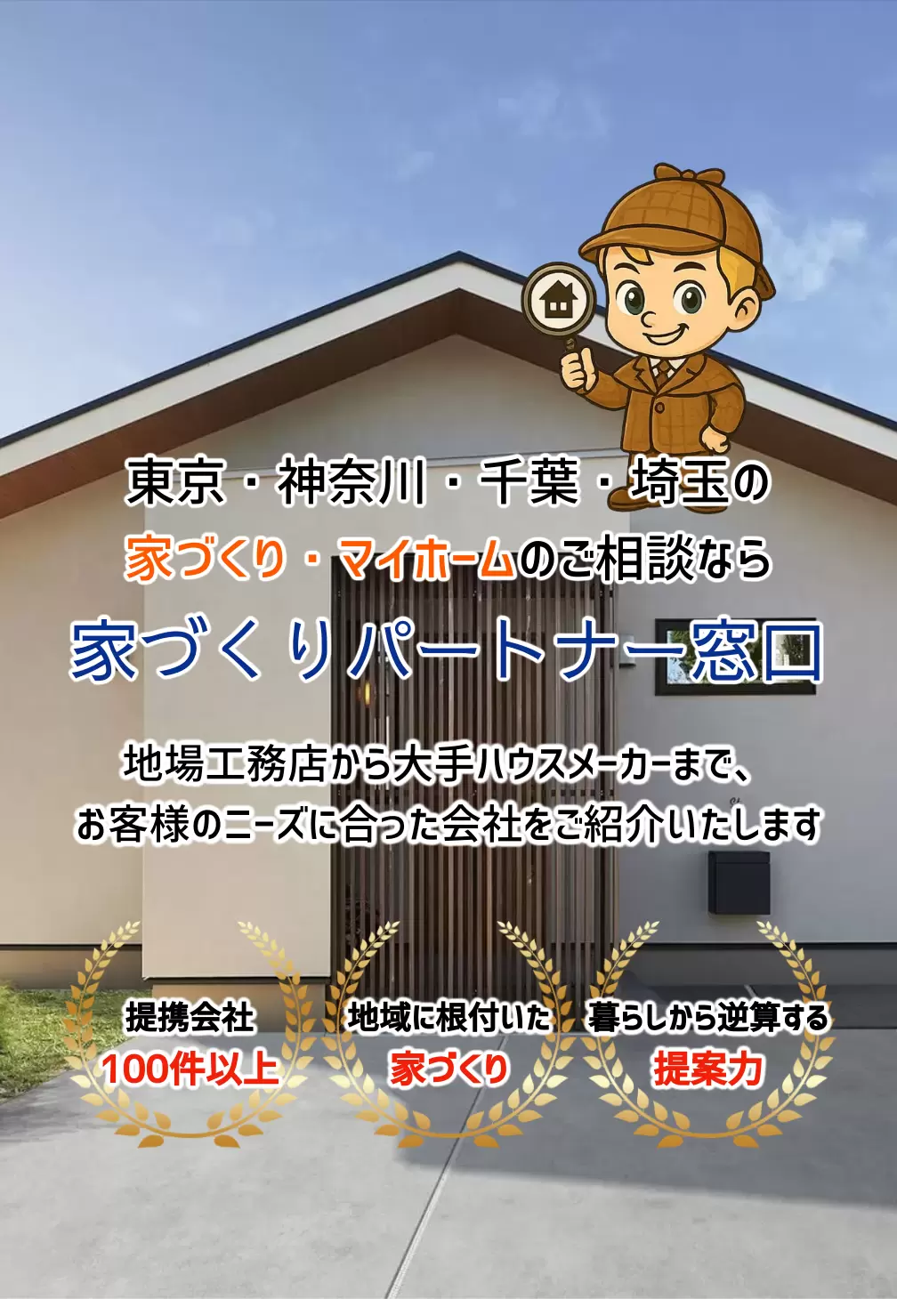 一都三県に100件以上の優良住宅会社と提携しており、地域性やデザイン、ご予算など様々な条件から最適な住宅会社を見つけるお手伝いをします。